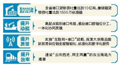 在提升港口發(fā)展動能方面,《方案》明確,我省將高起點規(guī)劃全省沿海港口布局,推動港口群錯位分工、一體化協(xié)同發(fā)展,合理預留港口岸線資源,完善碼頭、航道、錨地、內(nèi)陸干港等基礎(chǔ)設(shè)施布局。完善港口基礎(chǔ)設(shè)施建設(shè),加快大型化專業(yè)化碼頭泊位、航道錨地等公共基礎(chǔ)設(shè)施、LNG接收站配套工程建設(shè)和老舊碼頭升級改造。完善港口服務(wù)網(wǎng)絡(luò),推動碼頭物流向全程物流延伸,發(fā)展“門到門”物流服務(wù)。